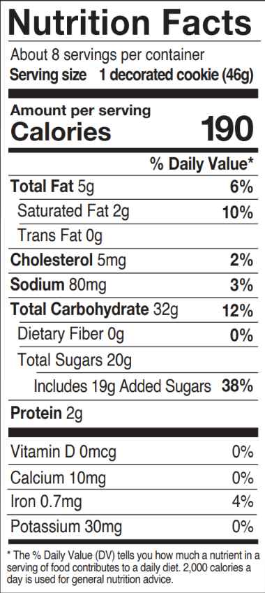 INGREDIENTS: COOKIE: BLEACHED ENRICHED WHEAT FLOUR (WHEAT FLOUR, NIACIN, REDUCED IRON, ASCORBIC ACID ADDED AS A DOUGH CONDITIONER, THIAMINE MONONITRATE, RIBOFLAVIN, ENZYME, FOLIC ACID), SUGAR, VEGETABLE OIL SHORTENING (CANOLA OIL, FRACTIONATED PALM OIL, FRACTIONATED PALM KERNEL OIL), WATER, INVERT SUGAR, CONTAINS 2% OR LESS OF: EGGS, NONFAT DRY MILK, LEAVENING (SODIUM BICARBONATE), SALT, NATURAL AND ARTIFICIAL FLAVOR. ICINGS: SUGAR, WATER, PALM OIL SHORTENING, CORNSTARCH, CONTAINS 2% OR LESS OF: HIGH FRUCTOSE CORN SYRUP, CORN SYRUP, MODIFIED CORNSTARCH, SALT, ACETYLATED MONOGLYCERIDES (EMULSIFIER), ARTIFICIAL FLAVOR, POLYSORBATE 60, POTASSIUM SORBATE (PRESERVATIVE), TITANIUM DIOXIDE (COLOR), CITRIC ACID, FD&C RED #40, BEET JUICE (COLOR), FD&C BLUE #1, FD&C YELLOW #5. PASTEL QUINS: ICING SUGAR (SUGAR, CORNSTARCH), FRACTIONATED PALM KERNEL OIL, MODIFIED CORNSTARCH, CONTAINS 2% OR LESS OF: SUNFLOWER LECITHIN, BEET POWDER (COLOR), FD&C YELLOW #6, FD&C YELLOW #5, FD&C BLUE #1, SHELLAC.